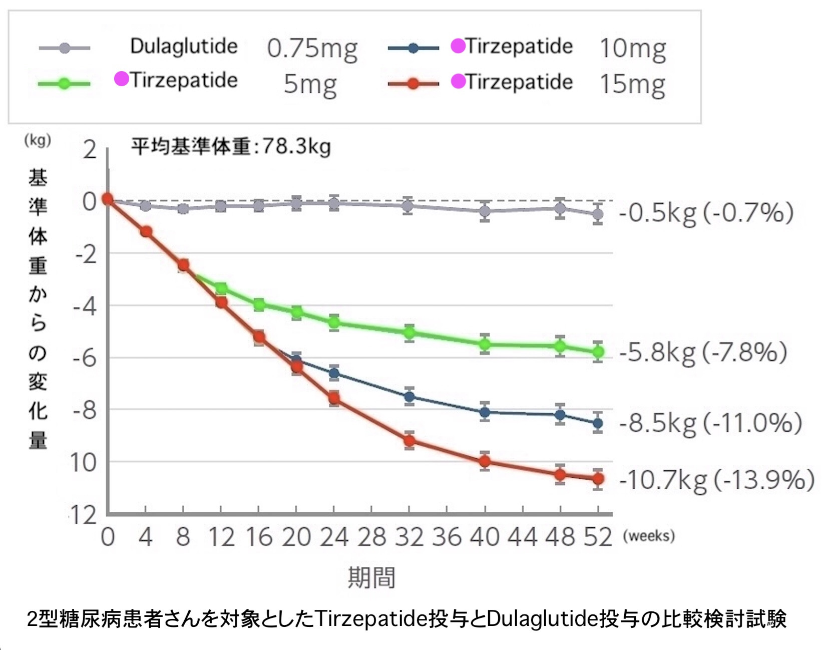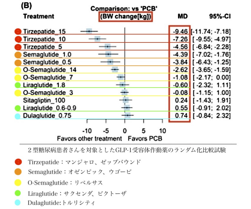 当院では、GLP-1受容体作動薬の中で、下記のように体重減少効果の高いGIP/GLP-1受容体作動薬であるTirzepatide(チルゼパチド、商品名:マンジャロ、ゼップバウンド)のマンジャロを使用します。